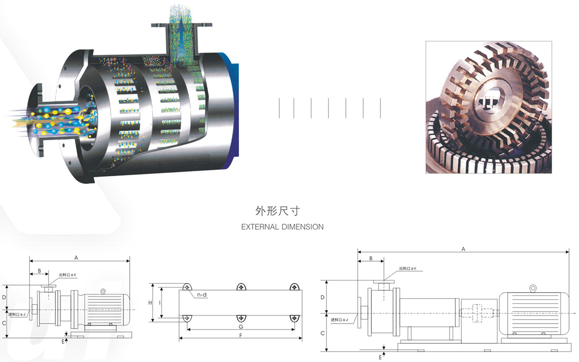 Pipeline high-cutting dispersal emulsification machine is a high-capability equipment producing and circularly treating refined material. There are 1-3 groups of occlusal multilayer stators and rotors in the limited cavity.The rotors circumrotate in a high speed by the motor driving and bring driving suction,which draws the material into the cavity.In the least time, the material is dispersed,cut and emulsified. The distributing scale of gains becomes narrower. The refined steady products are produced.The capability is large,so it is fit to continuously produce in the production line.The distributing scale of gains is narrow and it has high evenness, high efficiency,low-noise and saves time andenergy resources and runs smoothly, so it can clear up the difference of the products of different batches.100% material is dispersed and cut, which has the capability of short-haul and low-liftfeeding. ltis used and repaired easily and can realize automatic control.