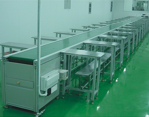 The equipment is applicable to manual packaging or automatic feeding of products in the packaging workshop of cosmetic plant,pharmacy plant,foodstuff and drink plant etc; the plank of the whole machine is assembled with aluminium alloy section bar; the table-board is made of stainless steel; the leather belt adopts light PVC or PU belt; the line speed adopts the stepless timing; the shape is handsome; the pattern is novel;transmission is balanced, operation is convenient.